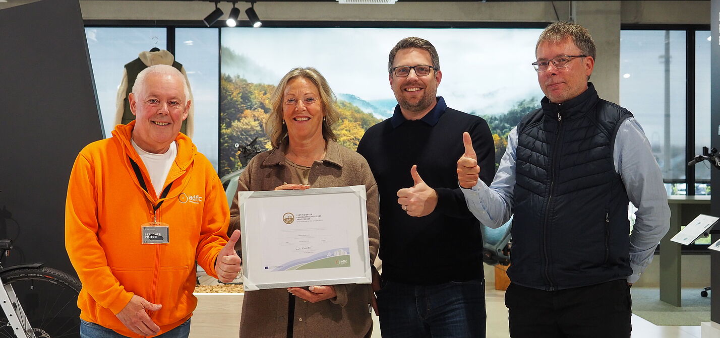 Die feierliche Übergabe fand in Emstek statt. Rüdiger Henze, Landesvorsitzender des ADFC Niedersachsen, und Uwe Schmidt, langjähriger Vorsitzender und Tourenleiter des ADFC Osnabrück e.V., überreichten die Auszeichnung an die Geschäftsführung von Kalkhoff, Mirjam van Coillie und Michael Birnbaum.